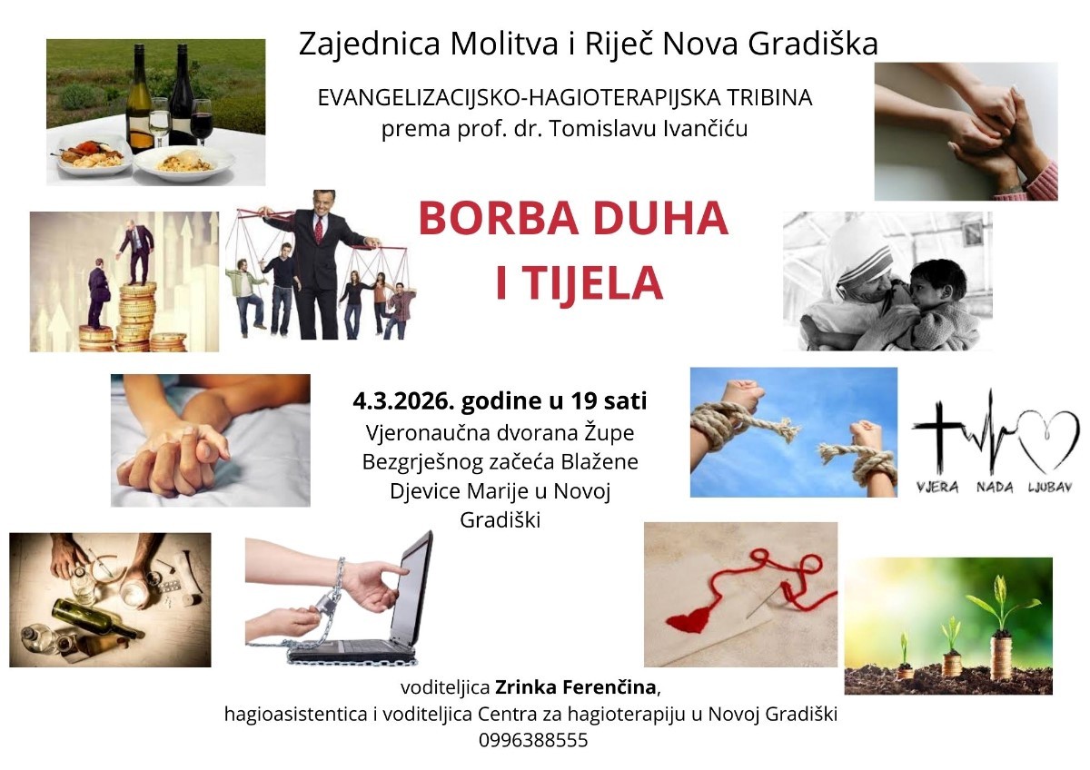Zajednica Molitva i Riječ 4.3. 2026. godine u 19 sati u vjeronaučnoj dvorani župe BZBDM u Novoj Gradiški organizira evangelizacijsko - hagioterapijsku tribinu prema prof. dr. Tomislavu Ivančiću. Voditeljica tribine je Zrinka Ferenčina, hagioasistentica i voditeljica Centra za hagioterapiju u Novoj Gradiški.