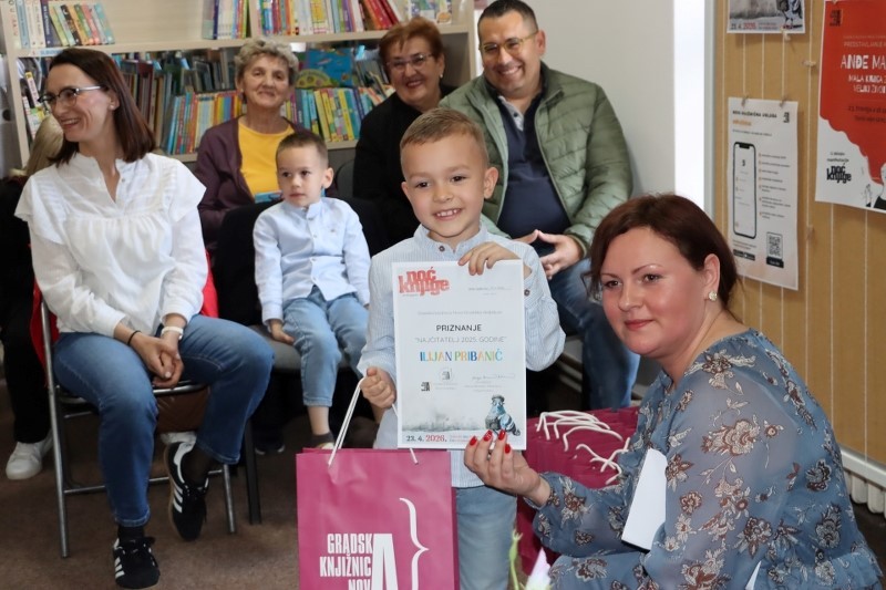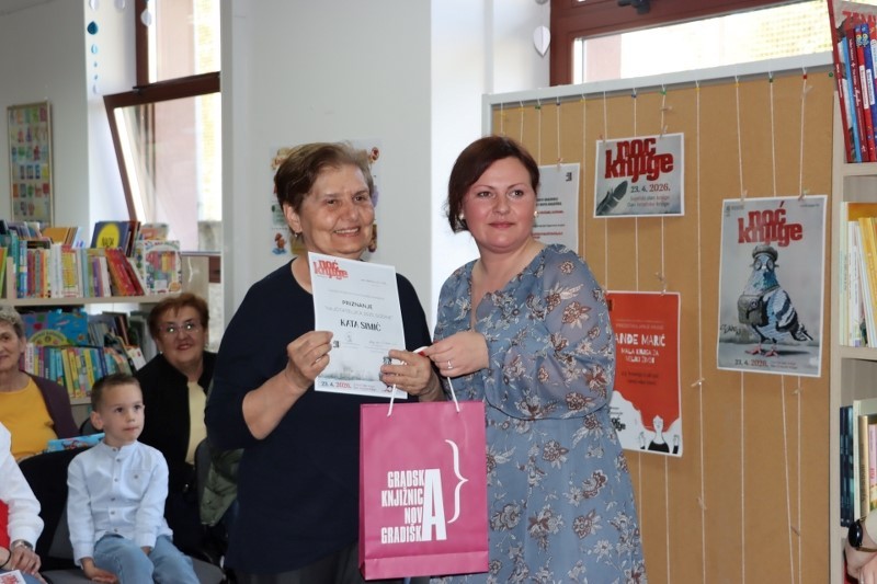 NOVA GRADIŠKA, 24. travanj 2026. – Povodom Svjetskog dana knjige jučer su Noć knjige u Gradskoj knjižnici Nova Gradiška obilježila brojna događanja. Započela je radionicom EmpaTI i JA, proglašenjem najčitatelja u 2025., promocijom knjige Anđe Marić “Mala knjiga za veliki život“ i akcijom Oprost zakasnine“Vratimo knjige doma“. Bila je to prigoda da se nagrade najveći ljubitelji knjiga priznanjima i prigodnim nagradama kao znak zahvale redovnim čitateljima za promoviranje i poticanje čitanja. Dobitnicima je priznanja uručila Marija Bradašić Mikolčević, ravnateljica Knjižnice.